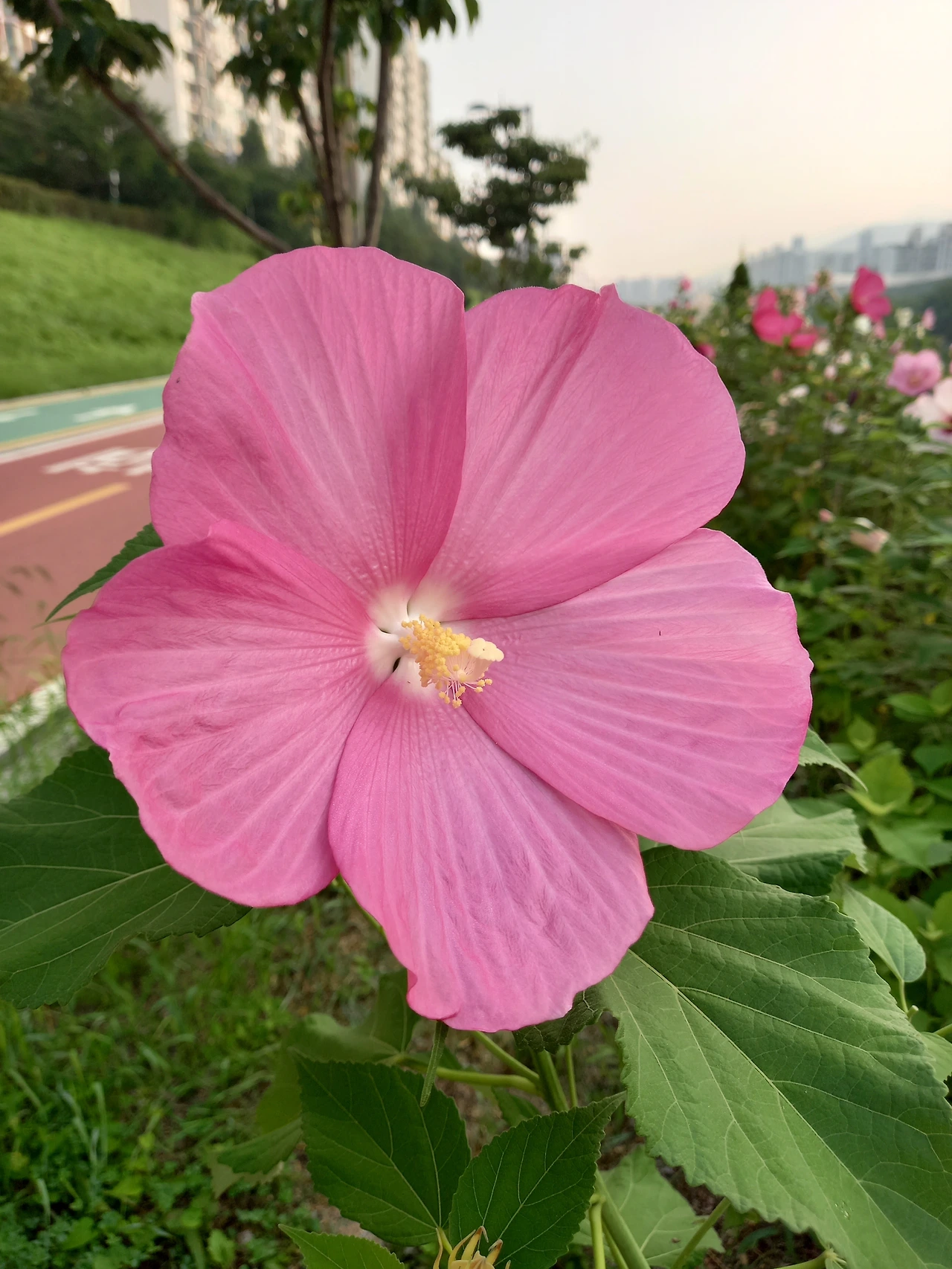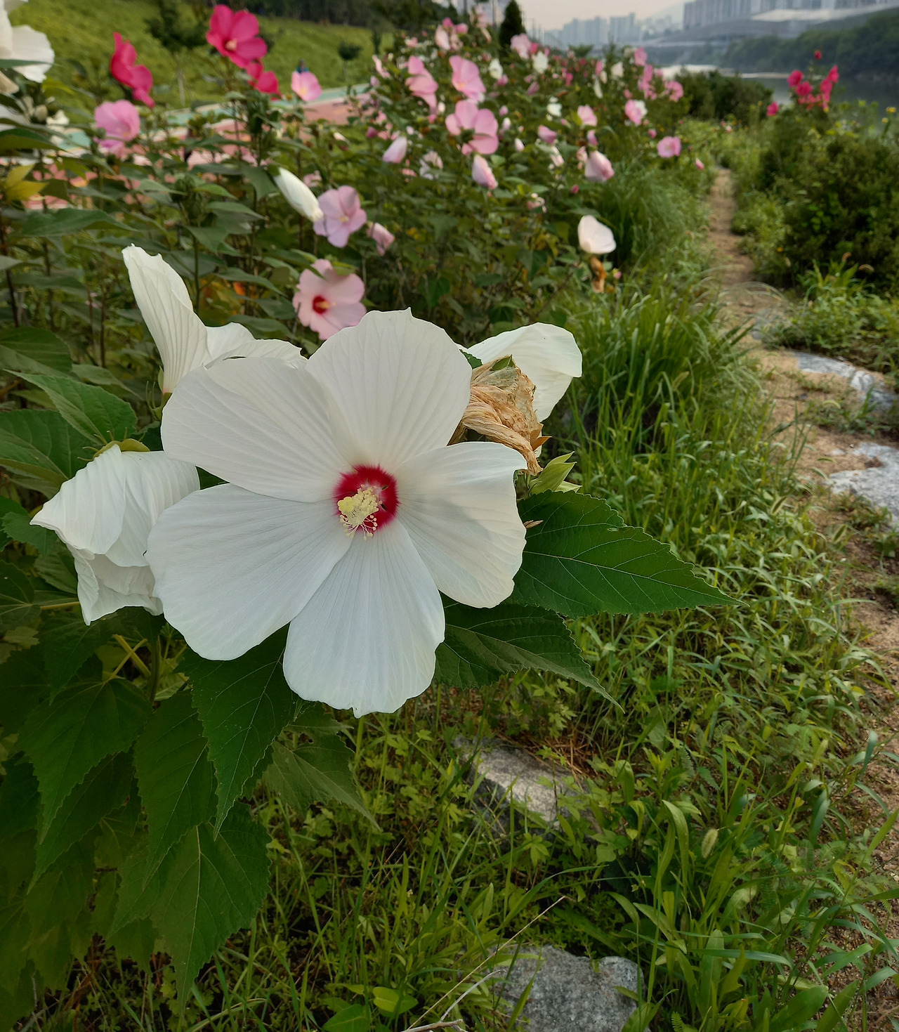 새벽 5시 30분 산책로는 텅 비었는데, 미국부용꽃밭에 홀로 사진을 찍는 사람들이 모였다.
