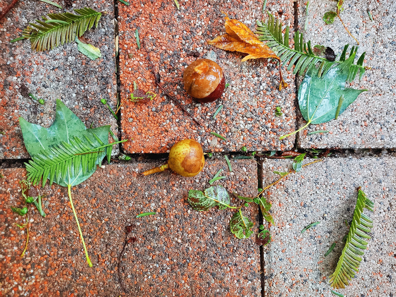 산책 길엔 플라타너스 열매도, 메타세쿼이아 나뭇잎도 있었다. 높이 매달려 있을 땐 보지 못했던 것들이었다.
