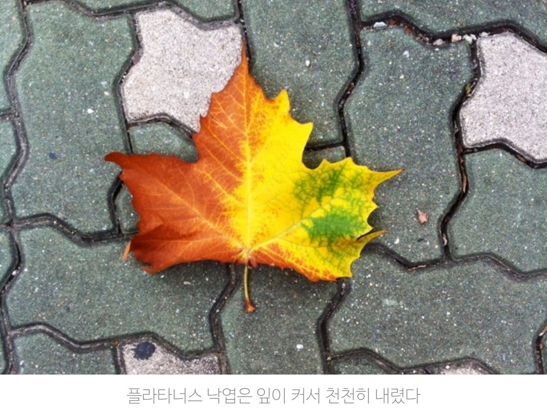 완전히 물들지 않은 플라타너스 잎 하나가 걸어가는 내 앞에 떨어져 있구나. 떨어진 낙엽을 보며 현실로 돌아와 버렸어. 아쉽지만 그 시간은 금방 사라져 버리고 말거든. 매일 작고 큰 일들이 나의 일상에서 만들지고 있다. 봉화산을 따라 도서관 가는 길은 플라타너스 나무가 자라고 있었지. 삼십 미터가 넘는 어마어마한 키를 가진 당당한 모습이었어. 우리 이름으로 양버즘나무라고 하는 이유가 나무껍질이 벗겨지며 버즘처럼 보여서라는데 나는 그 모습 더 좋단다. 벗겨진 회색 나무껍질 뒤로 보이는 연둣빛 속살은 정말 매력적이었거든. 올해는 너를 볼 수가 없구나. 보도블록 공사를 하더니 줄지어 서있던 너희들도 사라졌으니까 말이야.
