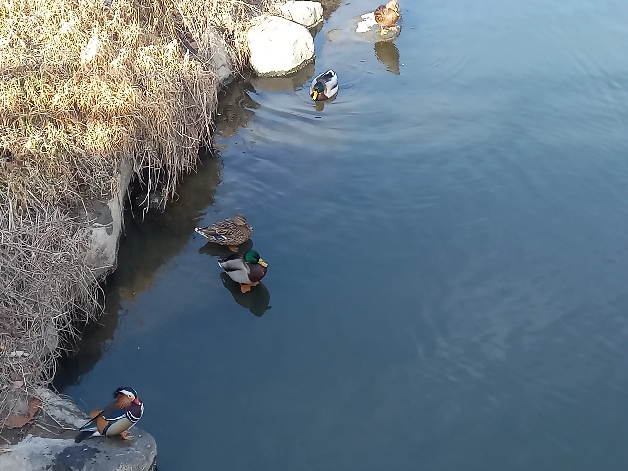 알록달록 고운 깃털을 한 수컷 원앙 한 마리 옆에 암컷 원앙이 보였다. 한 쌍인가 싶었는데, 갑자기 수컷 원앙이 줄줄이 3마리가 나타났다. 암컷 옆에 있던 원앙을 뒤에서 싸움걸 듯 원앙이 한꺼번에 달려들었다. 마치 경주를 하듯 네 마리의 수컷이 빠르게 중랑천 물 위로 들어갔다. 암컷은 유유히 물 위를 떠다니는데, 수컷 들은 바짝 자존심을 세우고 물러나지 않았다.