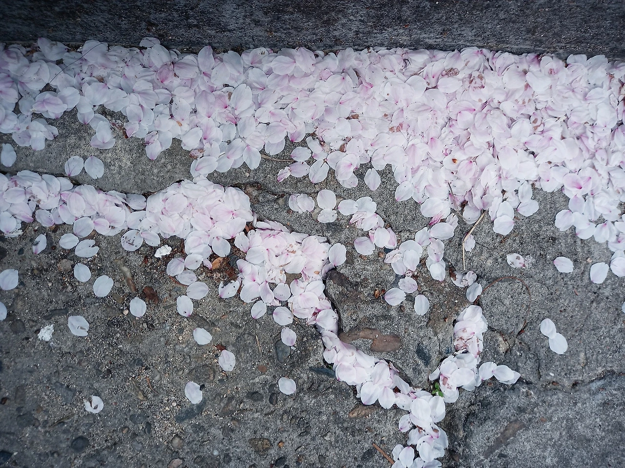 봄비가 만든 물 웅덩이 마다 벚꽃은 물놀이하듯 귀엽게 움직였고, 걸을 때마다 신발 바닥엔 꽃이 스티커처럼 달라붙었다. 꽃잎이 여러 겹 뭉쳐지면 신발에서 뚝 떨어지고, 다시 스티커를 하나하나 붙여가듯 또 달라붙었다. 길 따라 내가 만든 벚꽃 잎 발자국이 나를 졸졸 따라온 듯 느껴져, 남겨두기가 미안했다.