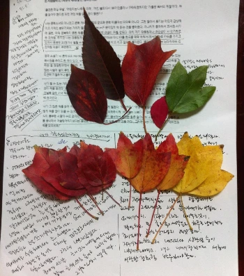 노트를 펴고 쓰다만 글을 찾는다. 사진을 찍으려고 모아 온 낙엽들을 보니 나무가 써놓은 노트 같다. 봄부터 가을까지 어떤 사연들을 모아두었을까? 청 단풍잎도 초록에서 노란색 점점 붉은색으로 물들어 간다. 그리고 모든 이파리들은 갈색으로 바뀌고 부스러지면 다시 흙으로 돌아간다.