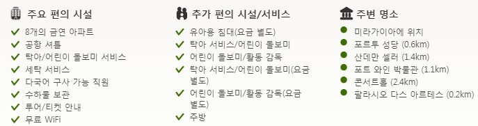 끝내기 전에, 아파트나 빌라에 대해 너무 좋은 점만 얘기한 것 같아서, 이런 형태의 숙소를 예약할 때도 체크해야 하거나, 감수해야 할 것들 몇 가지를 언급하고자 한다. 먼저, 체크인이나 체크아웃 시간이다. 호텔과는 달리 어떤 빌라나 Airbnb 숙소는 특히 체크인 시간에 제한이 있을 수 있다. 집주인이나 관리인이 직접 와서 키를 주거나 하는 경우가 대부분인데, 이렇게 그 시간이 정해져 있고, 비행기 시간 등의 이유로 그것을 못 맞춘다면 불편을 겪을 수 있다. 물론, 대부분의 경우에 도착 후 연락하여 정규 시간이 아닌 시간에도 체크인이 가능은 하지만, 이 경우 아이랑 가서 그나마 정신도 없는데, 시간 약속하고 하는 것이 불편하고, 로밍으로 돈도 나갈 수 있고, 특히 영어가 잘 안되거나 하는 분들은 (Airbnb 업체나 Booking.com 등의 큰 예약업체에 등록한 곳은 대부분 영어는 무조건 통함) 고생을 할 수도 있다.