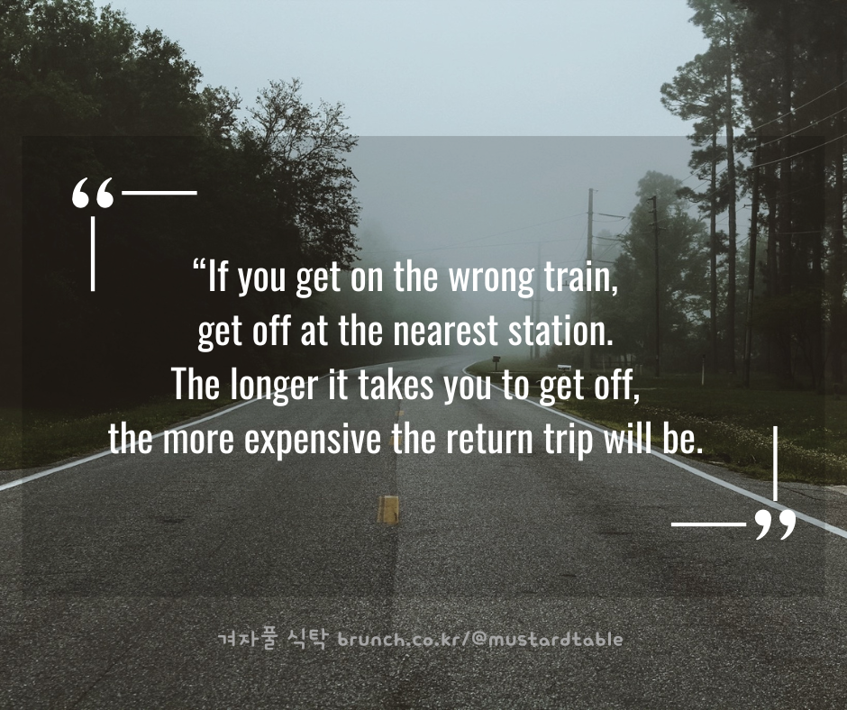 이 격언은 일본 철도요금 안내서에 적힌 구절에서 유래한 현대 격언이라고 합니다. "내릴 역이 멀어질수록 운임이 비싸짐"이라는 구절에서 "잘못된 선택에서 빠져나올 때는 한시라도 빨리 행동해야 불이익을 줄인다"라는 교훈을 찾아낸 거죠. 결국 저는 이 격언이 주는 교훈처럼, 아이들과 함께 '이생망'행 열차에서 내리는 선택을 고려하기 시작했습니다.