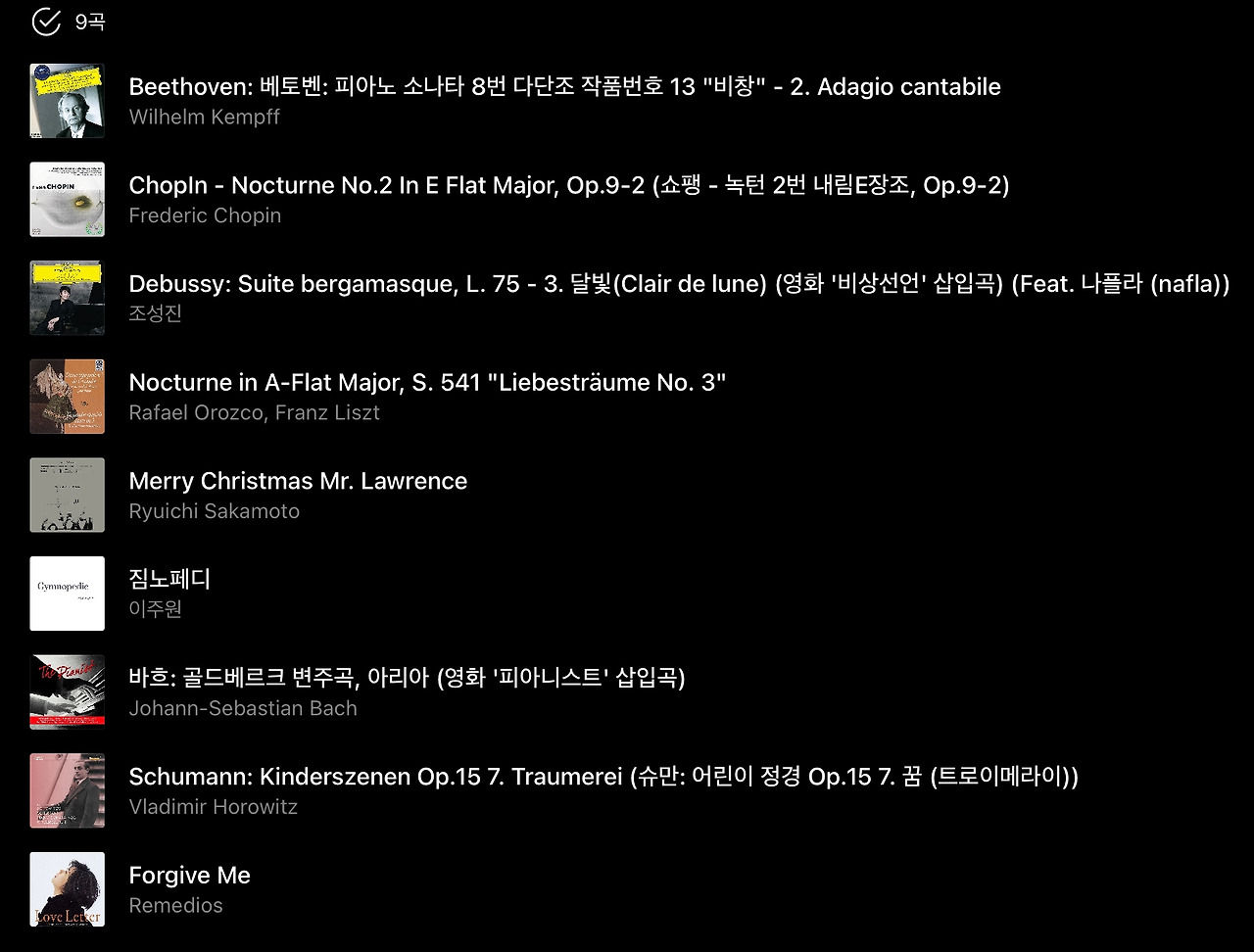 이야기를 처음 써봐서 음악의 도움을 좀 받았어요. 대략 10년간 성우지망생 생활을 했는데, 연기 배울 때 배경음악 도움을 많이 받았거든요. 그래서 각 이야기마다 배경음악을 정했어요. 이야기가 중구난방이 아닌 한 방향으로 흐를 수 있도록 마련한 장치였습니다. 배경음악은 작곡가 이야기와 곡 해설을 참고해서 정했습니다. 이야기 속에 녹여내기도 했습니다. 평소에 클래식을 좋아하기도 했고요. 저도 책 읽을 때 이어폰 많이 꽂고 읽거든요. 나중에 플레이리스트 들으며 읽어도 좋겠다는 생각도 했습니다. 그래서 글 전개도 되도록 곡과 비슷하게 진행되도록 썼습니다. (길이는 맞추는 것은 실패했습니다. 다만 무한 반복 재생하며 써서 그런지 템포는 비슷해졌습니다.) 그렇게 뽑힌 플레이리스트가 이렇습니다.