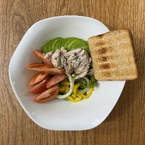 샐러드는 상추 5장을 뜯어 넣고, 양파 조금 그리고 토마토 한 개를 썰어 넣는다. 여기에 노란색 파프리카를 1/4조각, 아보카도 반개를 넣고, 올리브유 듬뿍 그리고 통후추 갈아서 조금, 토마토와 궁합이 맞는 소금도 조금 넣는다. 그리고 마지막에 간에서 독소를 배출해 준다는 발효사과식초 한 티스푼으로 마무리한다. 견과류가 있으면 견과류도 조금 넣어준다. 탄수화물은 통밀식빵을 토스트기에서 굽고, 단백질은 닭가슴살이나 참치캔 절반 또는 두부 반모를 넣는다.