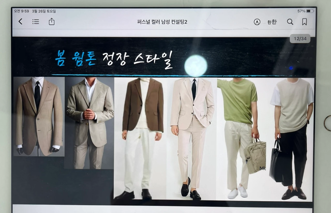 그다음으로 패션에 대한 컨설팅이 시작됐다. 봄 웜톤이 추구해야 할 패션 컬러는 간단히 말해서 파스텔 톤이었다. 그중에서 특히 나에게는 올리브 색과 하늘색, 흰색도 차가운 흰색 말고, 아이보리 같은 따뜻한 흰색을 추천했다. 그동안 부 해 보일까 봐 가장 피하던 색들이었다. 그리고 옷을 입을 때, 셔츠 파스텔 톤 입었다고 바지를 진한 색으로 입지 말고, 이른바 톤온톤으로 같은 계열의 파스텔 계열을 입으라고 추천해 줬다. 앞에 사진에서도 파마머리할 때는 까만 셔츠 입고 있는데... 흐흐흐 미용실에 변신하러 가서는 그나마 파스텔 비슷한 회색 후드를 받쳐 입고 찍혀있다. 가만히 생각해 보니 새 옷 입었을 때, 반응이 좋았던 옷은 대부분 베이지 색 옷들이었다.