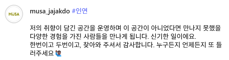 소란한 분위기 속에서도 잔잔함이 풍겨 왠지 모르게 마음이 갔던 분들. 이태원에 살던 부부는 고성으로 이사해 빛을 만든다. 공간 연출을 위한 오브제 조명을 맞춤 제작하는 일이다. 상호명은 '오로라댄스'인데 '빛의 춤'이라는 뜻을 갖고 있다. 대화의 중간쯤에 카메라를 꺼내시더니 우리가 수다 떠는 장면을 조금씩 촬영하신다. 유튜브 '탐닉가들' 채널을 운영하신다고 해서, 자기 전에 영상을 감상하다가 인스타그램 채널까지 타고 흘러가 조금 더 그분들의 이야기를 읽다가 잠이 들었다.