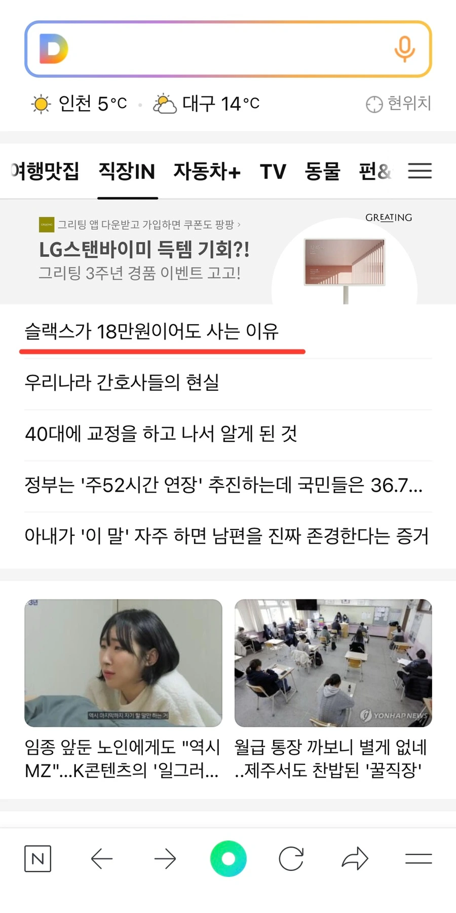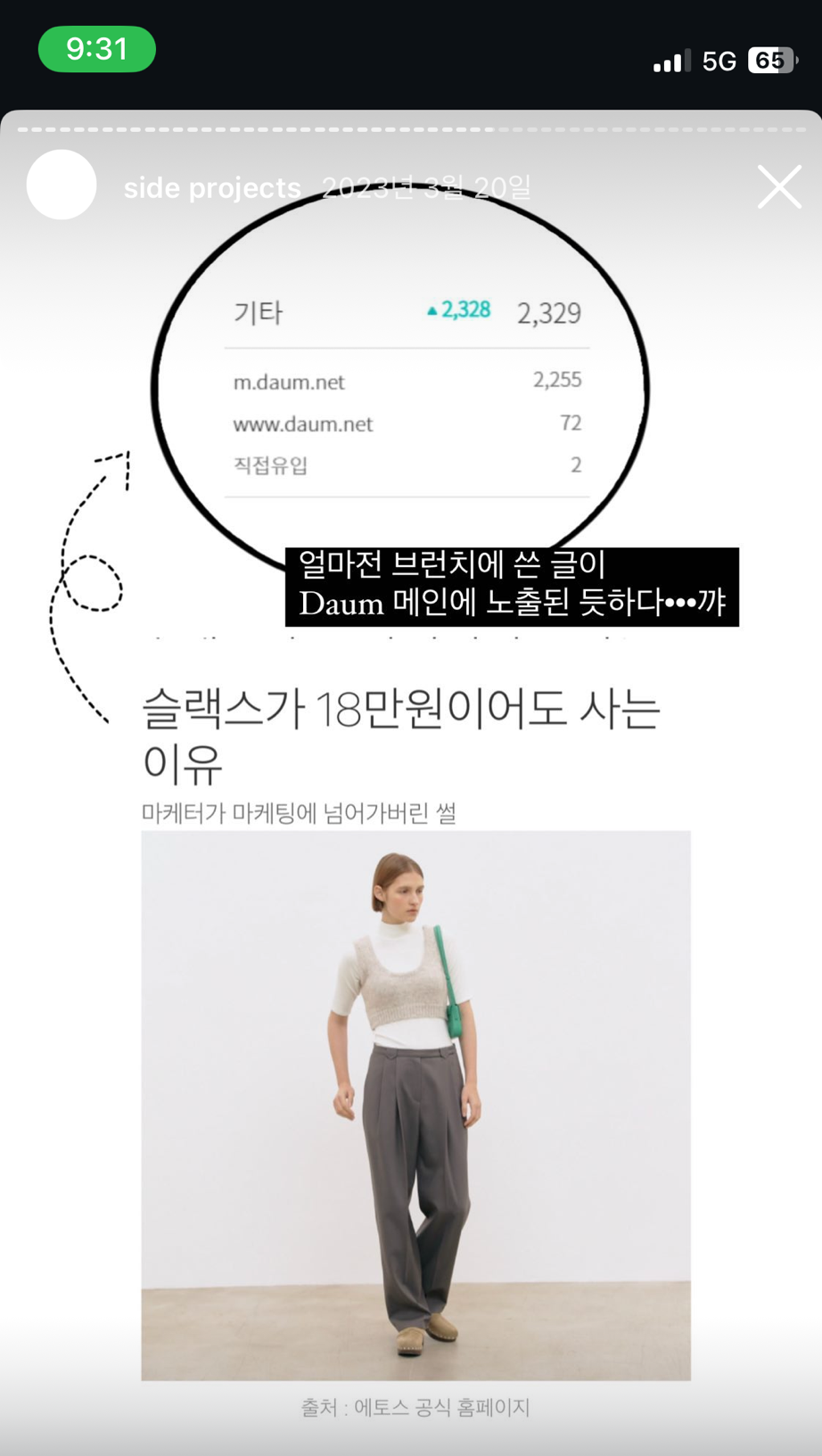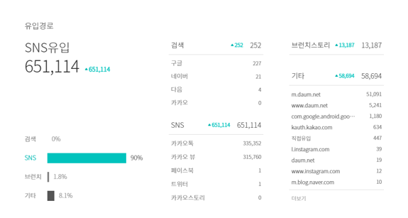 나의 글이 브런치가 아닌 또 다른 어딘가에 노출되고 있다는 사실을 처음 인지한 건, 브런치를 시작한 지 약 1년이 되었을 즈음이었다. 해당 글 <슬랙스가 18만원이어도 사는 이유>가 조회수 2만이 되면서 너무 궁금해졌다. 도대체 '기타 유입'으로 들어온 사람들이 대체 어디서 보고 내 글을 클릭하는 것인지. 샅샅이 뒤져가던 중에 다음/카카오탭 메인에 떡하니 노출되어 있는 나의 글을 발견했다. 아마도 그전에도 조회수 1천, 1만이 찍혔던 글들 이미 다음/구글에 노출된 것이었겠지만, '생각보다 브런치 이용자수가 많구나~' 하고 대수롭지 않게 넘겨버렸기에 이 귀한 장면들을 놓쳐버렸을지도...