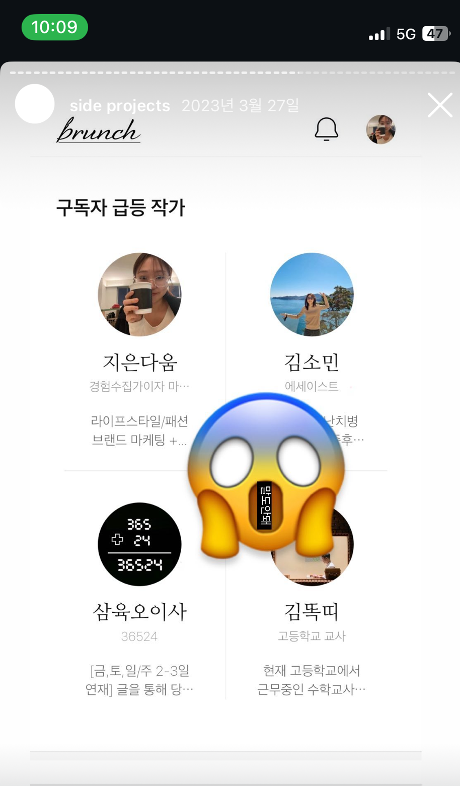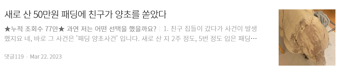 노출 로직에 힘을 얻은 걸까, 업로드 빈도를 조금 높였다. 그리고 얼마 지나지 않아, 더 잦은 빈도로 쉴 새 없이 알람이 울리기 시작했다. 해당 글의 조회수는 77만까지 치솟았고, 다음/카카오 노출과 더불어, 브런치 메인에 뜨는 구독자 급등 작가 지면까지 진출하게 되었다. 글의 제목은 <새로 산 50만원 패딩에 친구가 양초를 쏟았다>로, 오늘도 만나기로 한 나의 베프 Ana 와의 일화를 담은 글이었다.