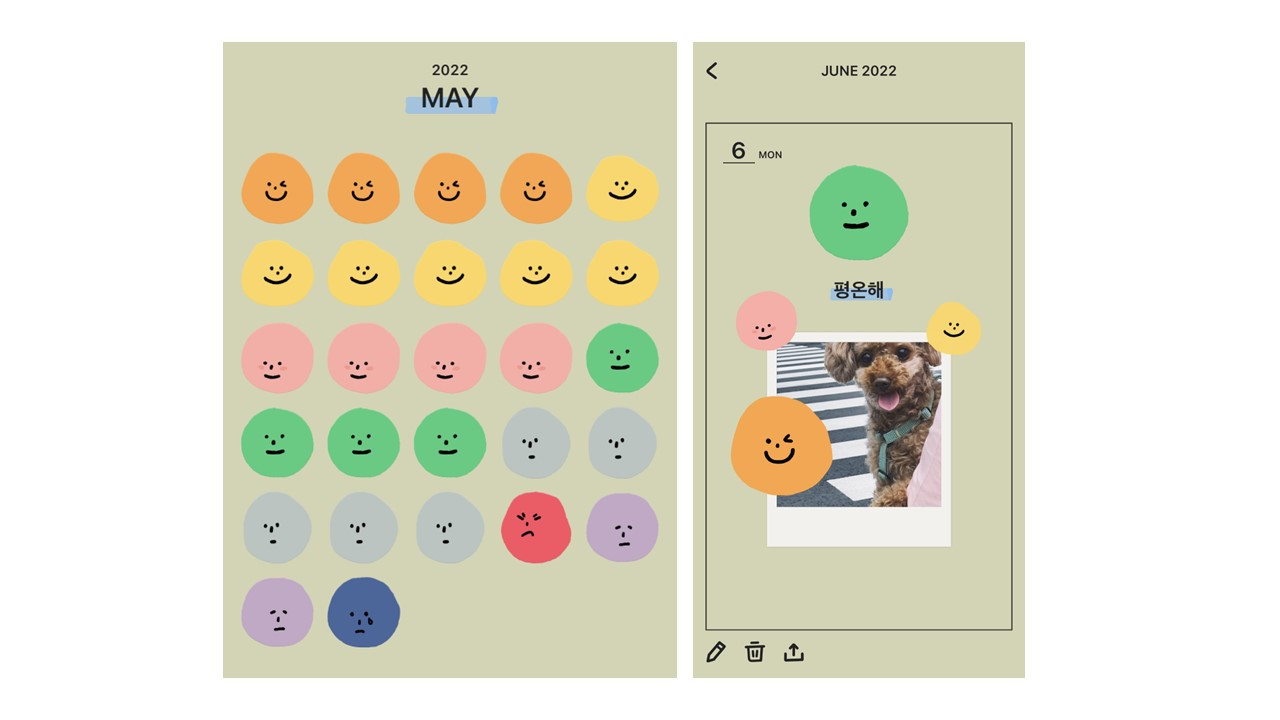 그런데 무다 앱을 통해 '표정'으로 매일 감정을 기록하니까, 나는 주로 언제 '기쁘고, 행복한지. 걱정하고 슬픈지'를 더 잘 알게 된다. 나 같은 경우는, 내 감정을 가장 크게 좌지우지하는 요인들이 '일'과 '관계'임을 이 일기를 통해 더 명확히 인지할 수 있었다. 새로운 관점에서 나를 한층 더 알아가는 시간들. 내 감정들이랑 더 친해지는 시간들.