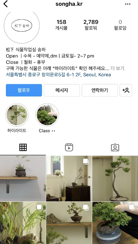 어제 부암동에 갔다가 저녁 먹고 나오는데 웬 가게 하나를 발견했다. '식물작업실 송하'. 인스타그램을 보고 식물을 전시, 판매하고 있는 공간임을 확인 후 망설임없이 들어갔다!