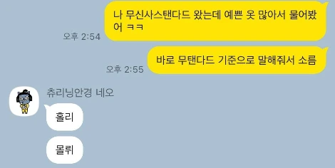 예전에 남자친구에게 '바지 사이즈 몇 입어?' 물어봤다가 '무탠다드 기준 34' 카톡을 받은 적이 있다. 놀랍게도 난 그때 실제로 '무신사 스탠다드 강남점'에서 쇼핑 중이었고, 남자친구에게 그 사실을 말하지 않았었다. 너무 신기하고 웃겨서 '와, 나 지금 무신사 스탠다드인 걸 어떻게 알고!! ㅋㅋㅋㅋ' 했던 기억이 있다.