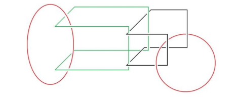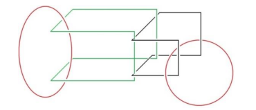 하지만 이 원과 일반적인 천구의 배열 사이의 차이는 다음과 같은 방식으로 벌어지게 됩니다. 즉, 이 중간에 놓인 원을, 만약 다음과 같은 배열로 바꾸게 된다면 말입니다: 그 원은 더 이상 접힐 수 없게 됩니다. 왜냐하면 그 원은 붉은 원에 대해서는 감싸는 것이고, 초록 원에 대해서는 감싸지는 것이기 때문입니다.