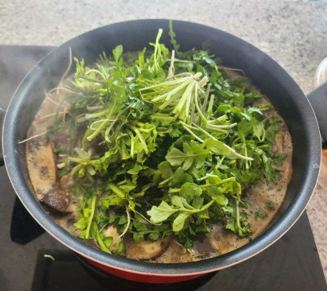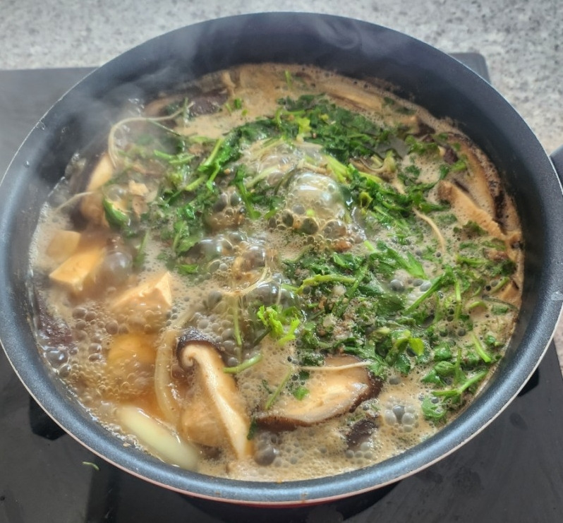 된장국에 넣은 야채에 간이 배어들 때, 냉이를 넣고 3분 더 끓여주면 끝이다.