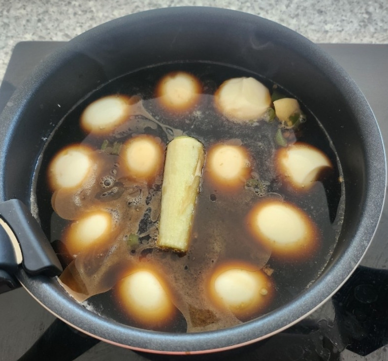 삶은 계란과 통마늘 여러 알. 대파 한토막. 한입크기로 썬 표고. 고추조미료를 2알 넣고
