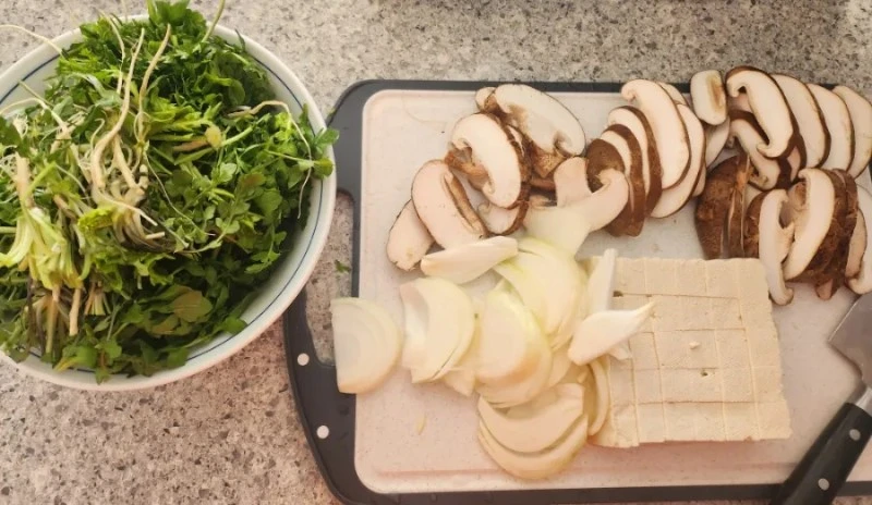 된장육수와 깐 달걀을 완성한 뒤, 냉이된장국에 들어갈 표고 5개. 양파 4분의 1. 두부한모를 썰어주었다.