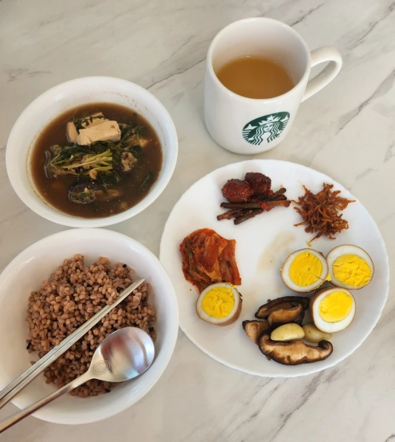 보리밥과(쌀이 똑 떨어져서 보리만 있었다) 냉이된장국, 오늘 갓 만들 표고버섯마늘계란장조림, 그리고 북극곰 본가에서 가져온 밑반찬(배추김치와 마늘쫑장아찌와 멸치볶음)