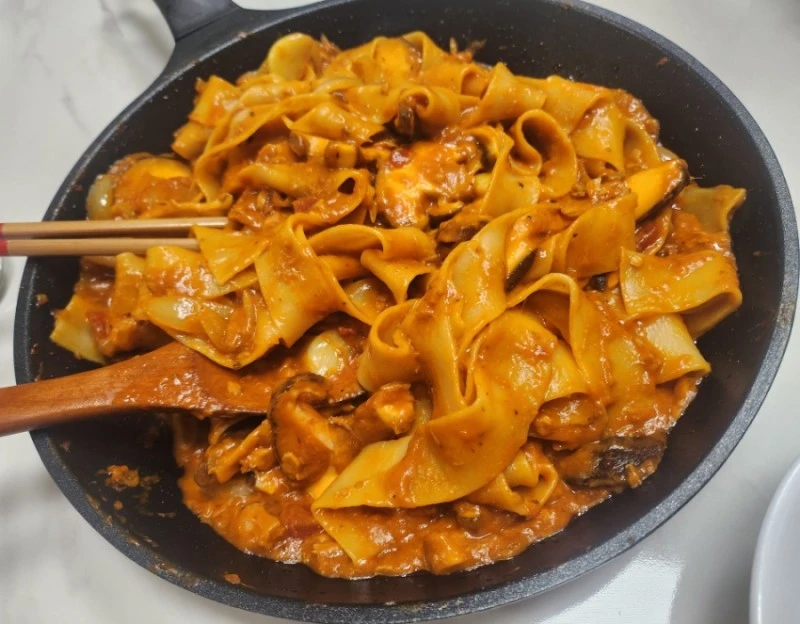 표고.참치.로제소스 넙덕한 면은 무엇인지 모르겠다.