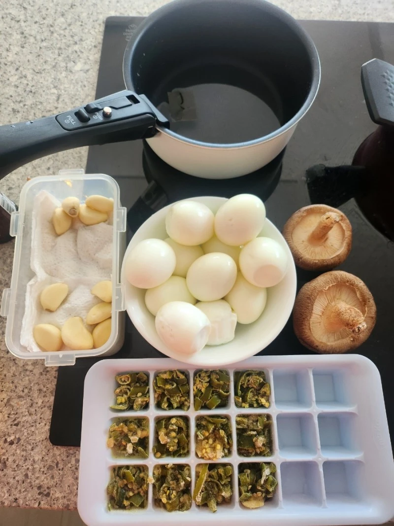 냉이를 손질하기 전, 된장국육수를 인덕션에 올리고 다음 한 주 동안 친구의 반찬이 될 표고버섯계란장조림 준비를 했다. 냄비 두 개면 된다.