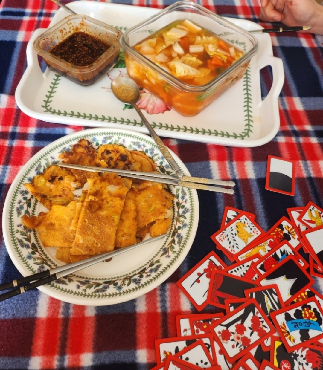 한 상 거하게 차려먹은 다음엔 아버지가 부쳐주는 김치전을 먹으면서 엄마랑 민화투를 쳤다.