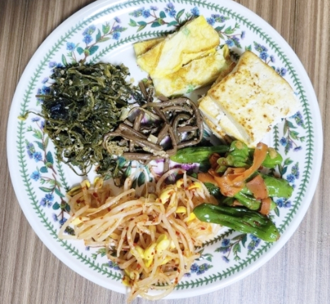 명절밥상의 기본 밑반찬은 파를 섞어 넣은 계란말이, 들기름두부구이, 감자칼로 채 썬 당근과 볶은 꽈리고추, 콩나물무침, 고사리나물, 묵나물이다.