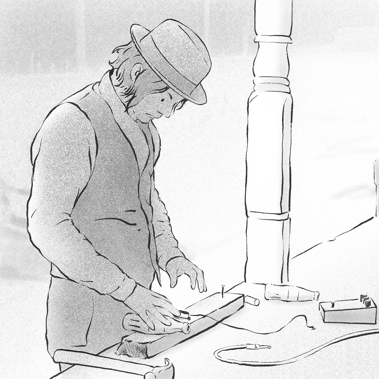 젖소가 ‘음메에’ 하고 운다. 챙 넓은 모자를 쓴 남자가 책상을 앞에 두고 서있다. 엠프를 멀찍이 둔 그는 검고 조그마한 나무를 꺼내 일자로 못질을 한다. 박아 넣은 못에 금속으로 이루어진 현을 잇고, 코카콜라 병 하나를 끼워 넣는다. 팽팽해진 현과 나무 사이에 현의 진동을 전기 신호로 바꿔주는 픽업을 위치시킨다. 이제는 악기가 된 나무를 엠프에 연결한 그는 이윽고 연주를 시작한다.