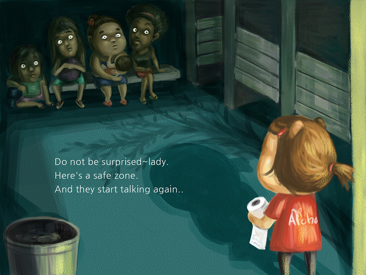 “나 너무 무서웠어. 화장실 안에 사람들이 서 있었더라고. 몸집이 전부 내 두 배는 되는 여자들이 어둠 속에서 동시에 나를 쳐다보는데, 갑자기 숨이 딱 멎는 거 있지. 늦은 시간인데 화장실에 왜 이렇게 사람이 많은 거야? 갑자기 이상하다는 생각이 드는 거 있지. 가만히 살펴보니까, 어린아이도 있더라고. 그런데, 놀라웠던 건 그중에 한 명은 남자였다는 거였어. 왜 여자 화장실에 남자가 있는 거지? 그냥 다시 나갈까? 뒤돌아서 나가도 괜찮을까? 저 사람들이 혹시 기분 나쁘다고 해코지 하는 건 아닐까? 그런 고민을 하고 있는데, 그중에 남자가 나한테 손짓을 하는 거야. 가까이 오라고 말이야.”