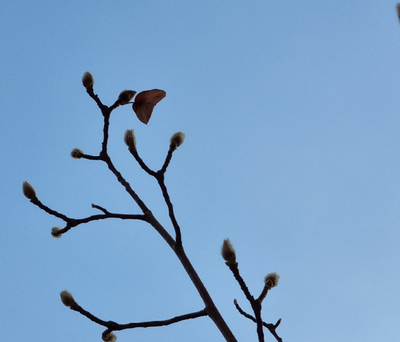 12월 12일 일요일 보송보송한 것들이 잔가지 끝마다 달려 있다. 꽃눈이겠지? 오른쪽 가지는 비어 있고 왼쪽 가지들에는 꽃눈이 열 개가 넘게 달려 있다. 나뭇잎은 더 떨어져서 우듬지 쪽에 서너 개 꼬부라진 황토색 조각으로 매달려 있다. 어제, 오늘 바람이 제법 세차게 부는데도 잘 붙어 있는 것이 신기하다. 마지막 잎새가 생각나네.