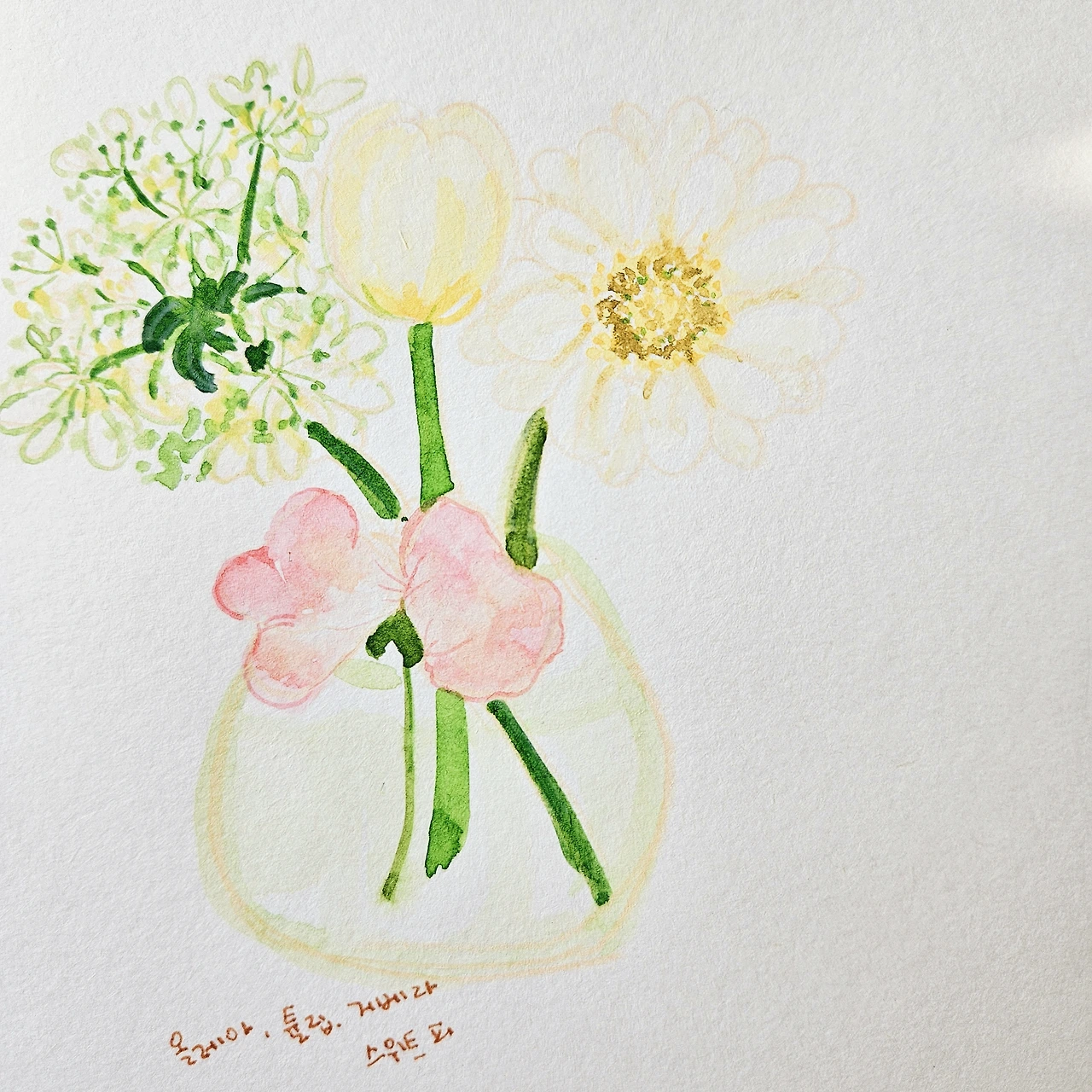 자잘하고 올망졸망한 동그라미가 귀여워서 들여다보니 꽃잎 하나하나 하트 모양이던 꽃. 이름을 찾아보니 올레아라고 했다. 아이보리색 거베라와 하얀 튤립, 하늘하늘한 스위트피를 따로 꽂아 식탁에 두고 분홍빛 스타티스와 소국(아닐지도)은 따로 공부방에 꽂았다. 일주일이 더 지난 지금 스위트피와 튤립은 시들고 없지만, 아직 반은 살아있다. 다음 주에 꽃 트럭이 오면 나가봐야겠다.