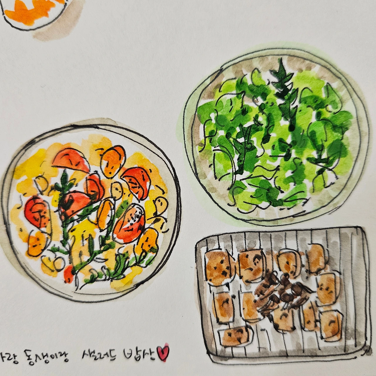 도서관에 예약한 ‘즐거운 어른’을 운 좋게 바로 빌려서 데일리 친구와 커피를 마시러 갔다. 친구에게 세트 쿠폰이 두 장 있어서 운동하고 신나게 달려간 던킨. 도넛과 커피는 언제 먹어도 맛있고, 이야기를 나누다 보면 화젯거리는 끝이 없다. 그것이 데일리 친구니까. 집에 돌아와 아이를 맞이하고 수업을 하고 저녁에는 엄마와 여동생이 왔다. 초밥을 배달시키고 토마토와 마늘, 두부와 버섯을 구워 샐러드를 만들었다. 처음 배달시킨 초밥집도 샐러드도 성공이었다. 낮에 사과밭에서 일하면서 툭하면 짜증을 부리는 아빠 때문에 체기를 얻은 엄마가 소화제를 먹고 나아져서 다행이었다.