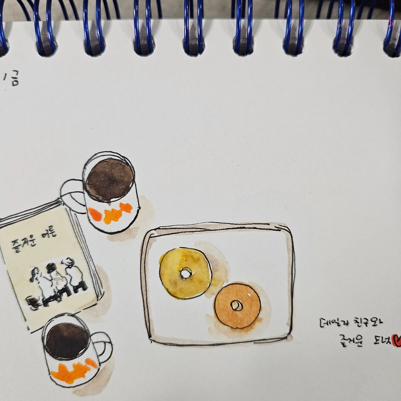 카페 가서 커피를 한 잔 마시며 그림일기를 스케치했다. 엄마가 병원에서 본 커플 이야기에 맞장구치며 분노하다가 여름의 그림 퀴즈를 맞히다가 정신없는 커피 시간이지만 좋았다. 이모가 일찍 가자 여름은 몹시 서운해했지만, 막상 손님들이 가자마자 달콤한 빵을 먹으며 잘 놀았다. 실컷 옥토넛 만화를 보고 그림일기를 색칠하는 내 옆에서 여름도 그림을 그렸다. 이만하면 명랑한 일주일.