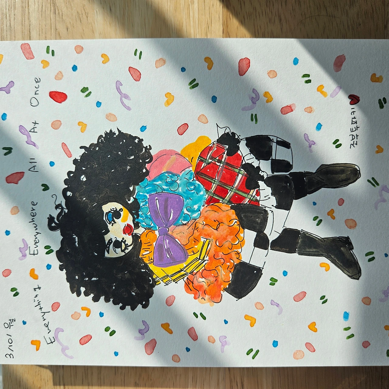 영화 ‘Everything Everywhere All At Once’를 다시 보았다. 처음 볼 때도, 다시 볼 때도 좋았고 이번에 또 볼 때도 좋았다. 나에게는 너무 어려운 다정함에 대해, 언제까지나 곁에 있어 주는 일에 대해 생각했다. 내가 사는 어떤 우주도 특별하지 않겠지만, 꿈이나 공상에 의지할 필요를 못 느낀다는 점에서 어른이 되었구나 싶었다. 뻥 뚫린 공허를 응시하며 모든 것이 사라지기를 바라도, 결국은 내 허무를 함께 봐주는 사람을 기다리는 것일 뿐. 세상은 크고 복잡하지만, 사람은 작고 단순하다. 조부 투파키의 오만 가지 스타일링 중에서 어떤 걸 그릴지 고민하다 골라본 열두 겹 레이어드 니트/스커트/셔츠/담요 옷.