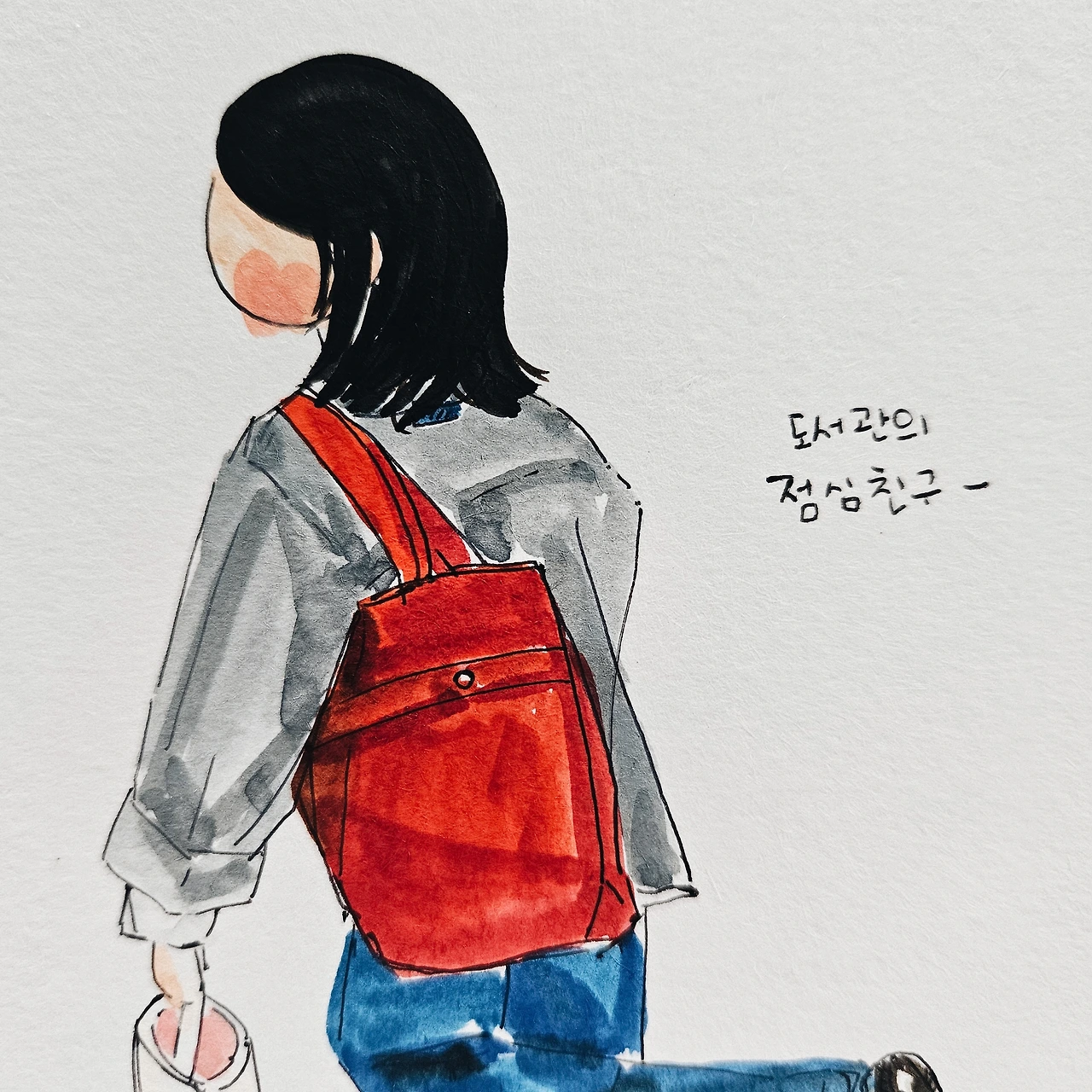 집김밥이 최고라고 법석 떨 수 있는 건 내가 김밥을 싸지 않을 때나 할 수 있는 말이었다. 반채소주의자인 딸아이를 위한 김밥에는 햄과 달걀만 있으면 되어서 우리 집에서 김밥 먹기는 어느 때보다 수월한 일이 되었지만, 나는 이런저런 채소가 듬뿍 든 김밥을 좋아하니까 김밥은 역시 번거로운 음식이다. 대식가인 남편 때문에 열 줄을 말아도 하루면 사라지는 나의 집김밥은 좀 서글프기도... 그러니 내가 좋아하는 건 가게에서 사 먹는 김밥이다. 참치김치, 고추냉이마요, 새우김밥, 유부김밥... 좋아하는 김밥을 사서 육개장 사발면과 먹는 간편한 기쁨을 누리고 싶다. 단무지 외 채소를 제거한 어린이 김밥 두 줄을 아이 몫으로 주면 간편하고 든든한 한 끼. 오늘은 중앙도서관에 가는 날이면 먹을 수 있는 김밥킹의 커다란 김밥을 먹었다. 벤치에서 봄풍경을 보면서.