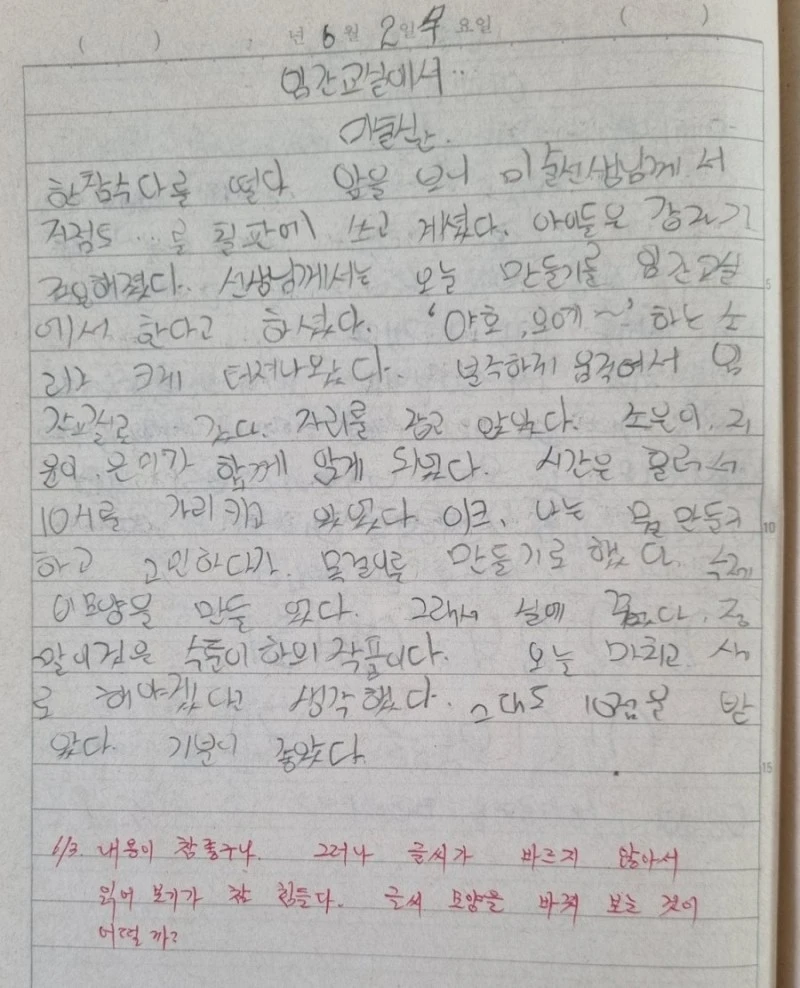6학년 담임 선생님은 아주 가끔씩 멋진 댓글을 남겨주셨는데 나는 그 댓글을 더 자주 받고 싶어서 어느 날 용기를 내보았다. 일기장 아랫부분에다가 이렇게 쓴 것이다. ㅡ선생님, 제 일기에 평을 써주세요. 저는 그게 좋아요.라고. 그랬더니 선생님이 뭐라고 댓글을 달아주셨냐면 ㅡ일기를 평을 하는 게 아니지요.