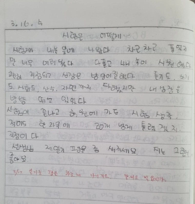 일기를 쓰며 제일 좋았던 것은 선생님이 댓글을 달아주는 거였다. 매일 50명이나 되는 아이들의 일기장을 관심 있게 읽는 것이 가능한 일인가 싶지만 그때는 볼펜 글씨를 발견한 날이면 그저 선생님과 비밀 이야기라도 나누는 특별한 아이가 된 듯한 느낌에 기뻐했다.내가 우리 반에서 주제에 맞는 일기를 열심히 쓰기로 선생님과 약속한 몇 명의 아이들 중 하나였으니 선생님도 최선을 다해 나의 일기 쓰기를 독려해 준 거였겠지만. 3학년 때 처음으로 일기장으로 상을 받았고, 4학년 담임 선생님도 일기를 잘 봐주었고(나중에 엄마로부터 촌지를 요구했었다는 말을 전해 듣고 뒤늦게 상처받았다), 5학년 담임 선생님이 특히 내가 글쓰기 하는 걸 많이 응원해주었다(나중에는 내가 자꾸 귀찮게 한다고 느끼신 듯했지만).
