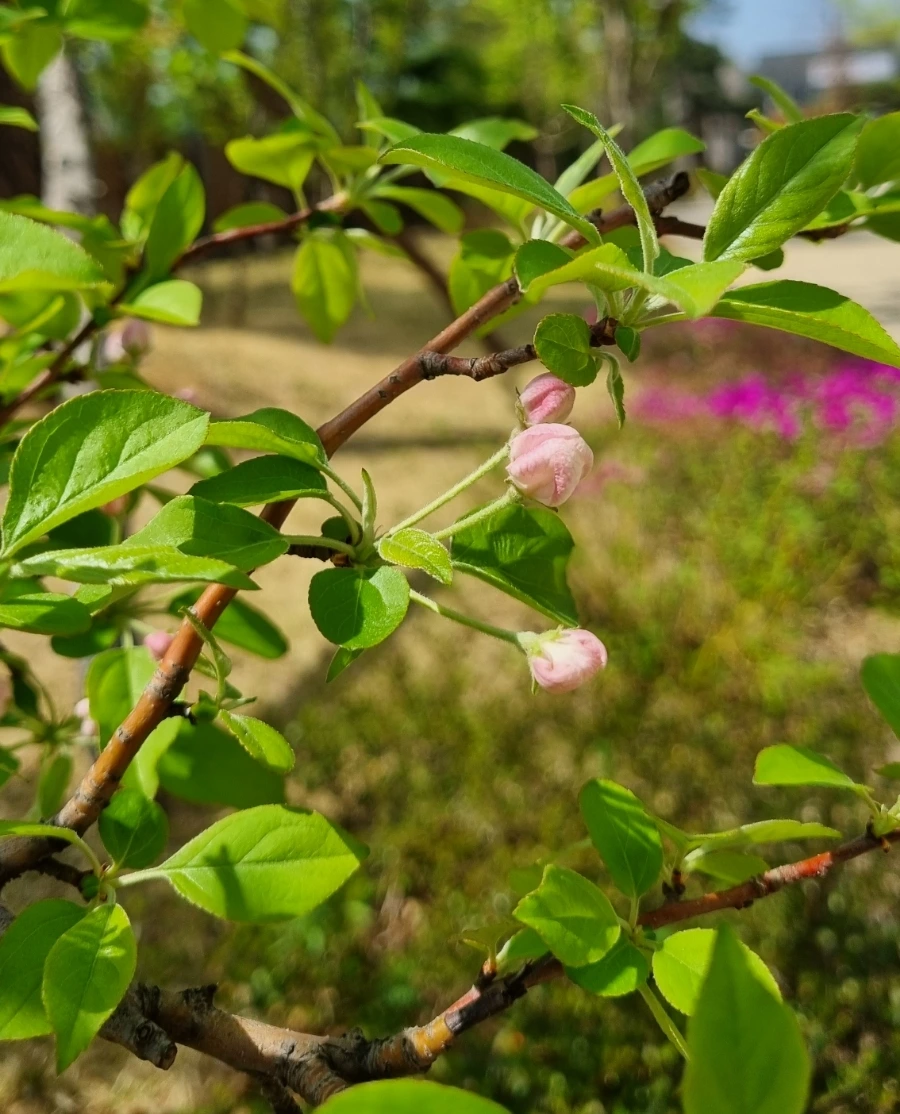 꽃사과나무와 라일락이 꽃을 피우기 시작했다. 꽃사과는 분홍색 꽃봉오리로 맺혀 있다가 새하얀 꽃을 피워낸다. 흰색과 분홍의 조합은 세상에 많고 많지만 여린 잎 끝에 한 방울 톡 떨어뜨린 붉은빛을 발견하면 그저 물끄러미 바라볼 수밖에 없다. 어쩌면 이렇게도 사랑스러울까, 하며. 양지바른 곳의 라일락은 벌써 꽃잎이 말라간다. 화단 곳곳에 심긴 라일락은 바람이 한 번 불 때마다 향기로 자신을 알린다. 들여다볼수록 하나하나가 귀여운 라일락 옆에는 황매화가 풍성하다. 황매화도 만개했다. 잎의 초록빛도 한여름처럼 짙어졌고 꽃잎들은 아이들의 크레파스 그림보다 선명한 노란색이다. 박태기나무의 오밀조밀한 꽃들은 눈이 부신 자주색, 조팝나무의 밥풀만한 꽃잎들은 달빛 같은 흰색이다.