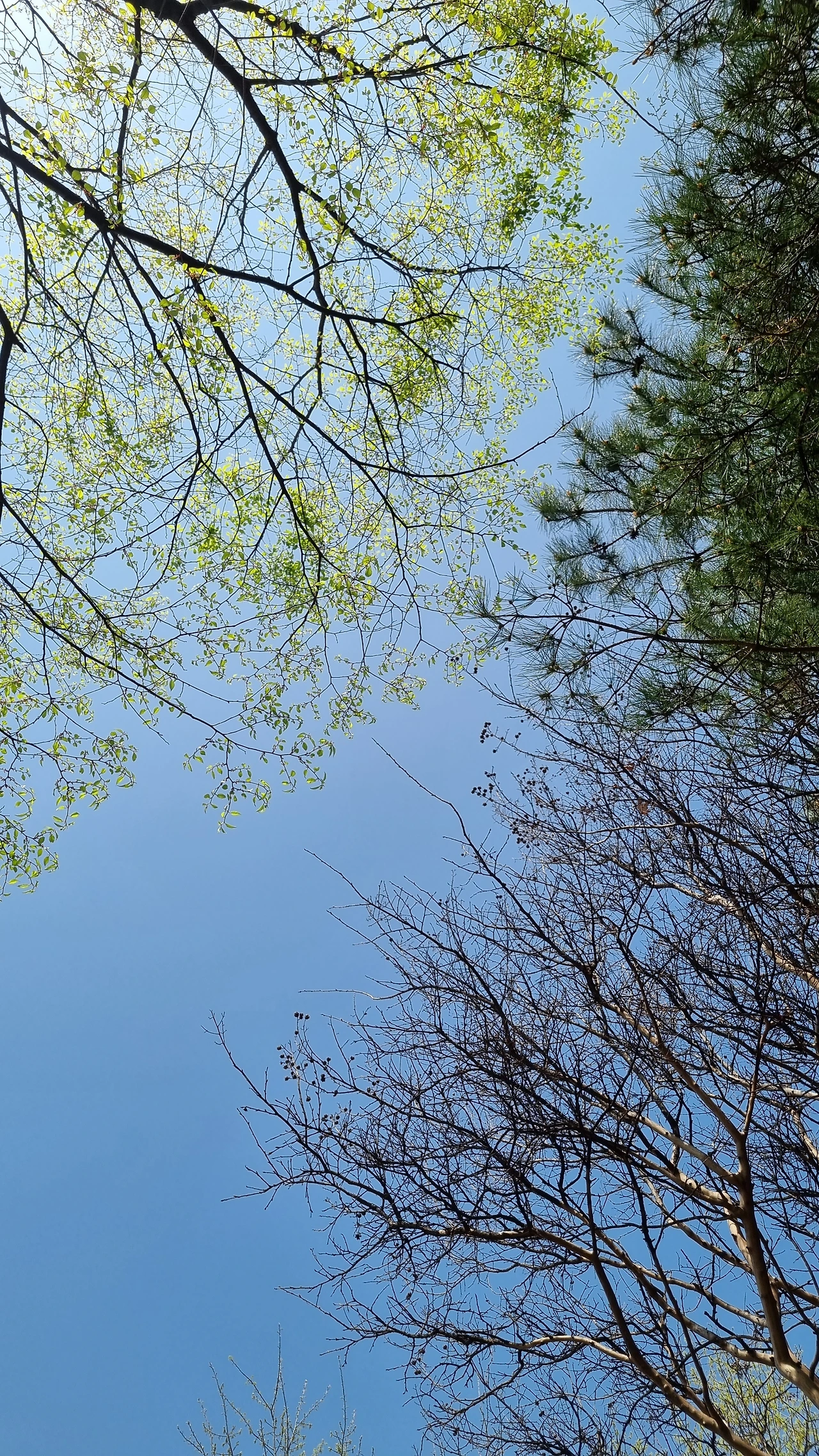 내리막길을 걸으면 인도 안쪽은 단풍나무, 차도 쪽은 왕참나무가 가로수인 부분이 있다. 왕참나무는 겨우내 달고 있던 마른 잎들을 4월이 훌쩍 넘겨서야 떨쳐낸다. 4월 중순이 다가오는 오늘도 마른 잎과 앙상한 가지가 높이 뻗어있다. 마주 보고 선 단풍나무의 연두색 무성한 이파리와 대조되어 더욱 계절에 어울리지 않는다고 생각하는 찰나, 새 잎이 돋아난 왕참나무가 바로 옆에 서 있었다. 드디어, 너에게도 봄이 오는구나. 단풍나무와 함께 찰칵 사진을 찍어주었다.