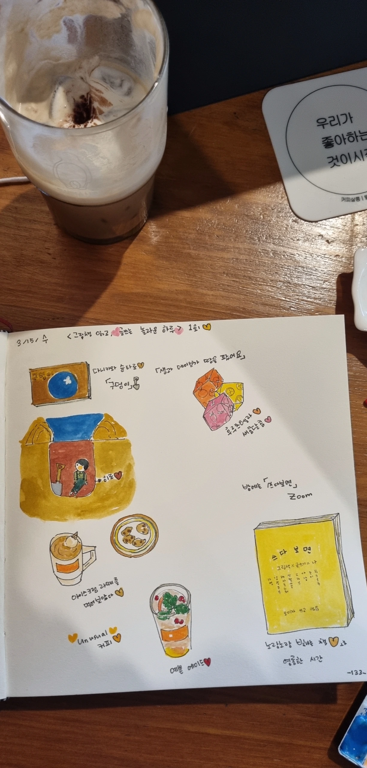 “책에 답이 있는 건 아니지만, 답 비슷한 그 무언가가 있을 가장 높은 확률을 찾는다면 책이 최선이다.” <철학의 위안-알랭 드 보통> 1년 가까이 찔끔찔끔 읽어나가는 책에서 멋진 문장을 발견하고 기뻐하는 짧은 순간을 작고 소중한 내 구덩이에 간직하기로 한다. 이틀 치 그림일기를 몰아 그리면서 빈자리에 방금 읽은 문장을 써넣는다. 읽다 만 책들이 펼쳐진 아일랜드 식탁과 내 그림책이 꽂힌 전면 책장, 알록달록한 팔레트와 까만 일기장을 보며 속으로 말해본다. ‘이건, 내 구덩이야.’
