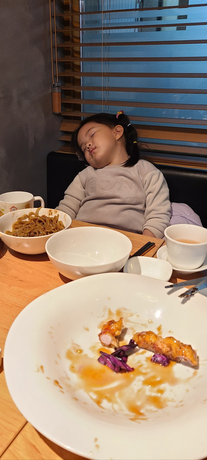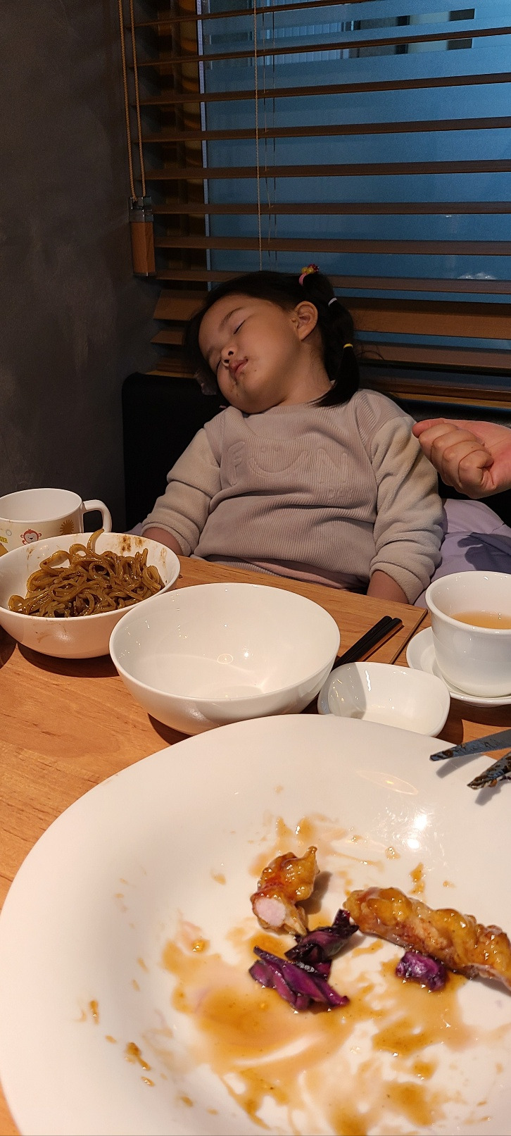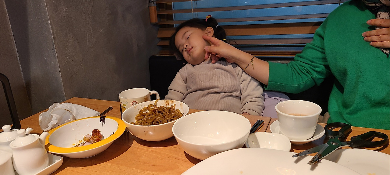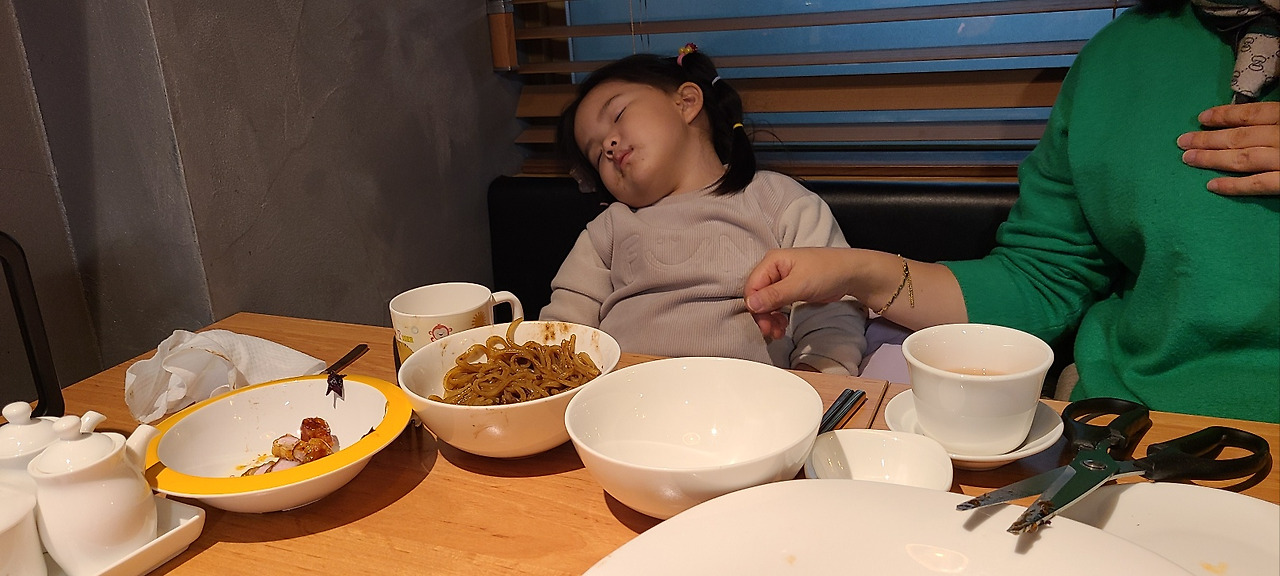 며칠 전, 와이프의 생일이었다. 그래서 와이프의 퇴근시간에 맞춰 막둥이를 어린이집에서 데려왔다. 그리고 학원에 있는 언니들을 픽업해서 우리 막둥이가 제일 좋아하는(엄마 생일인데 왜 막둥이가 좋아하는?) 중국집 S에 갔다. 막둥이는 자장면을 시키고 우리는 탕수육과 요리를 시켜서 조잘대며 먹고 있었는데 어디선가 들려오는 낮게 코 고는 소리... 놀랍게도 막둥이의 코 고는 소리였다.