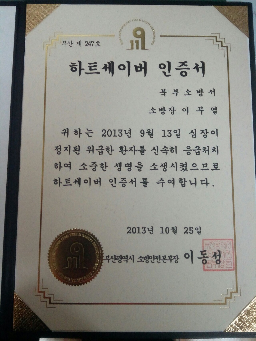 그렇게 우리는 무사히 병원에 도착했고 준비하고 있었던 의료진에게 그를 무사히 인계할 수 있었다. 몇 달 후, 그는 음료수를 들고 우리 119 안전센터를 찾아와서 그때는 정말 고마웠노라며, 앞으로는 더욱 조심하겠다고 말했다. 심장에 스탠드 시술을 받았다는 말과 함께. 그의 어두운 표정에 내 마음도 조금 무거워졌지만 그래도 그만하길 다행이라며 그를 위로했다. 한 달쯤 뒤에 나는 부산소방 본부장님으로부터 하트세이버 뱃지(심폐소생술과 AED를 활용해 심장이 멎은 사람을 살린 사람에게 주는 뱃지)를 받을 수 있었다. -그 해에만 두 명을 살려 두 개를 받았는데 나머지 한 개를 받은 이야기는 다음 기회에~-