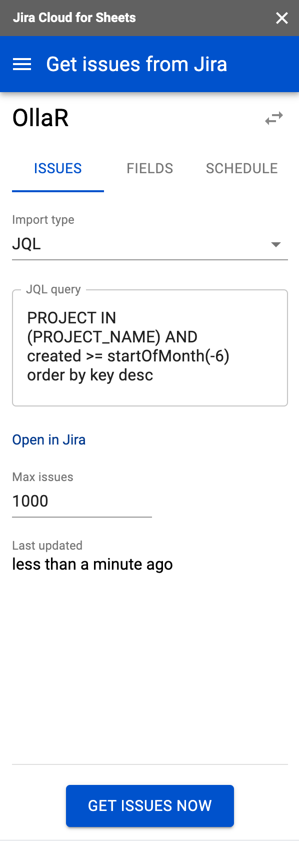 JQL 이나 Filter 등을 활용해서 가져올 이슈를 정할 수 있습니다.