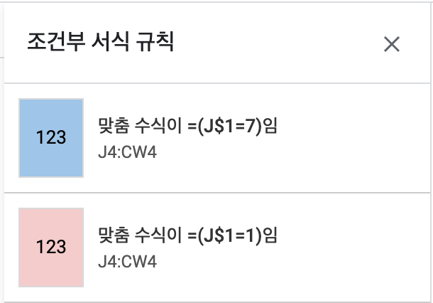 조건부 서식에 대한 활용은 https://brunch.co.kr/@muyeolhong/7 를 참고하세요~