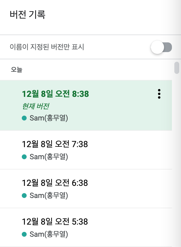 스케줄이 정상 동작을 하면 데이터가 변경이 되면서 시트의 버전 기록도 갱신이 됩니다. "파일 > 버전 기록 > 버전 기록 보기"에서 확인이 가능합니다.