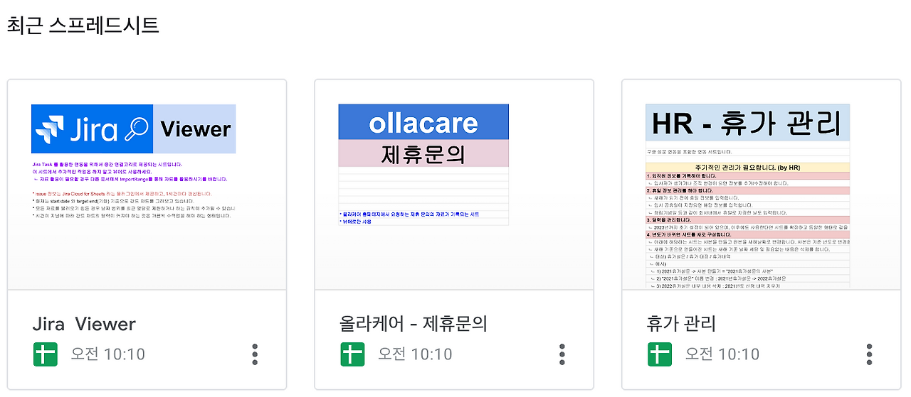 이렇게 하면 구글시트를 사용하면서 자주 만나는 "최근 스프레드시트" 목록에서 빠르게 문서를 찾을 수 있는 장점이 있고, 그 밑에 있는 설명들도 읽어보게 되는 부가적인 효과가 있기 때문입니다.