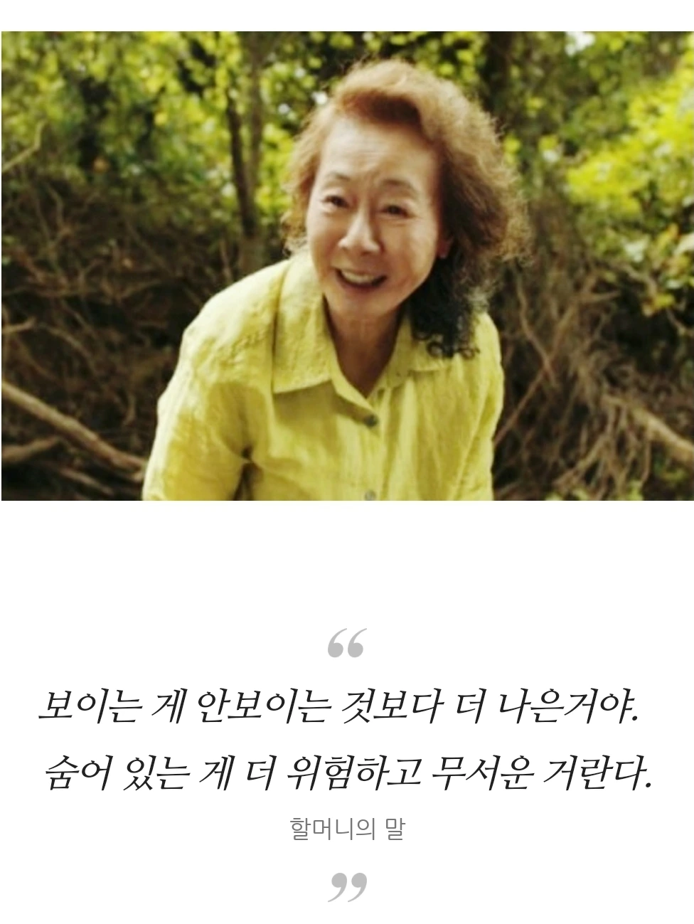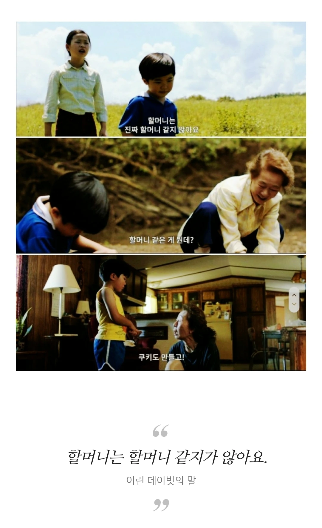 할머니를 따라 간 미나리밭에서 뱀을 발견한 데이빗이 막대기로 뱀을 치우려 하자 할머니 순자가 말리며 한 말이다.