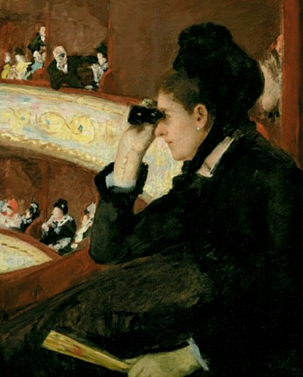 뮤지컬 좋아하세요? 저는 아주 좋아합니다. 한 달 전쯤 큰 맘을 먹고, 가장 좋아하는 <노트르담 드 파리> 한국어판 공연을 관람하고 왔습니다. 어둑하고 막힌 공간에 있는 것이 싫어서 영화관도 가지 않는 편이지만, 다행히 뮤지컬 공연장에서는 답답함을 잘 느끼지 않습니다. 공연을 관람한 후여서 인지 메리 카사트의 <관람석에서(In the Loge)>(1878)에 더 눈길이 갑니다. '나 홀로 관람'하는 여인 여인은 한껏 멋을 낸 듯 보입니다. 그런데 검은 옷을 입고 있네요. 상복이 아닐까 하는 의심이 듭니다. 화려한 여느 관람석의 여인들과 다르게 목덜미까지 올라온 검은 드레스에 조그만 귀걸이 외에는 다른 꾸밈은 전혀 없습니다. 그녀의 치장에서 상중이라는 심증에 확신이 드네요. 한 손에 부채를 들고 있는 것을 보니 상류층인 듯합니다. 작은 오 페라 글라스를 잡고 있어서인지 손목이 살짝 불편하게 느껴지네요. 잠자리 날개 같은 얇은 장갑에 드러난 실밥 같은 이미지에도 뭘까 하며 다소 필요 없는 부분에도 신경이 쓰입니다. 왠지, 이 여인이 낯이 익습니다. 어딘가에서 본 듯한 기분이 듭니다. 어디서 봤지? 한참을 들여다봅니다. 생각났습니다. 몇 년 전, 뉴욕 메트로폴리탄 미술관에서 본 존 싱어 사전트의 <마담 X>의 여인과 너무나 닮았다는 생각이 들었습니다. '마담 X'는 피에르 고트로 부인의 초상입니다. 혹시 이 여인이 '마담 X' 일지도 모른다는 생각이 드리겠네요. 생각이 여기까지에 이르자, 반갑기까지 합니다. '마담 X'의 관능미는 없고, 청초하고, 무언가에 몰입하고 있는 여인 같습니다. 고트로 부인이 공연을 관람한다면, 아마 이런 모습이 아닐까 합니다. 박스석을 둘러봅니다. 잘 차려입은 남녀들이 공연을 관람하고 있습니다. 그중에 한껏 멋을 낸 신사가 이 여인을 바라봅니다. 처음에는 신사의 시선을 살짝 의심했습니다. 우리나라의 아침드라마에서 볼 수 있는 뻔한 남녀 만남의 클리셰 같아, 피식 웃기도 했고요. 그런데 여인의 옷이 상복이라는 생각이 들자 다르게 보였습니다. 상중이라 외출이 힘든 여인이 관람석에 있으니, 신사의 눈에 띈 듯합니다. 그러거나 말거나 여인은 주변의 시선에 아랑곳하지 않습니다. 부채로 얼굴을 가릴 법도 한데, 그러지 않고 있습니다. 오로지 공연에만 집중하고 있습니다. 제가 여인에게 끌리는 까닭입니다. 검은 드레스와 대비되는 하얀 피부, 특이한 손동작, 오뚝한 콧날은 다른 사람들의 시선을 받을 만합니다. 클로즈업한 이여인만 또렷하고, 다른 인물들은 아웃포커스한 것처럼 선명도가 떨어지네요. 지금 여인은 어딘가를 바라보고 있지만, 신사의 시선에 포착되기도 하네요. 이 바라봄과 보임이 묘하게 어울립니다. 순간 다른 생각이 듭니다. 이 여인은 지금 보는 걸까요? 듣는 걸까요? 문득 극장 속의 공연과 음악이 궁금해집니다.