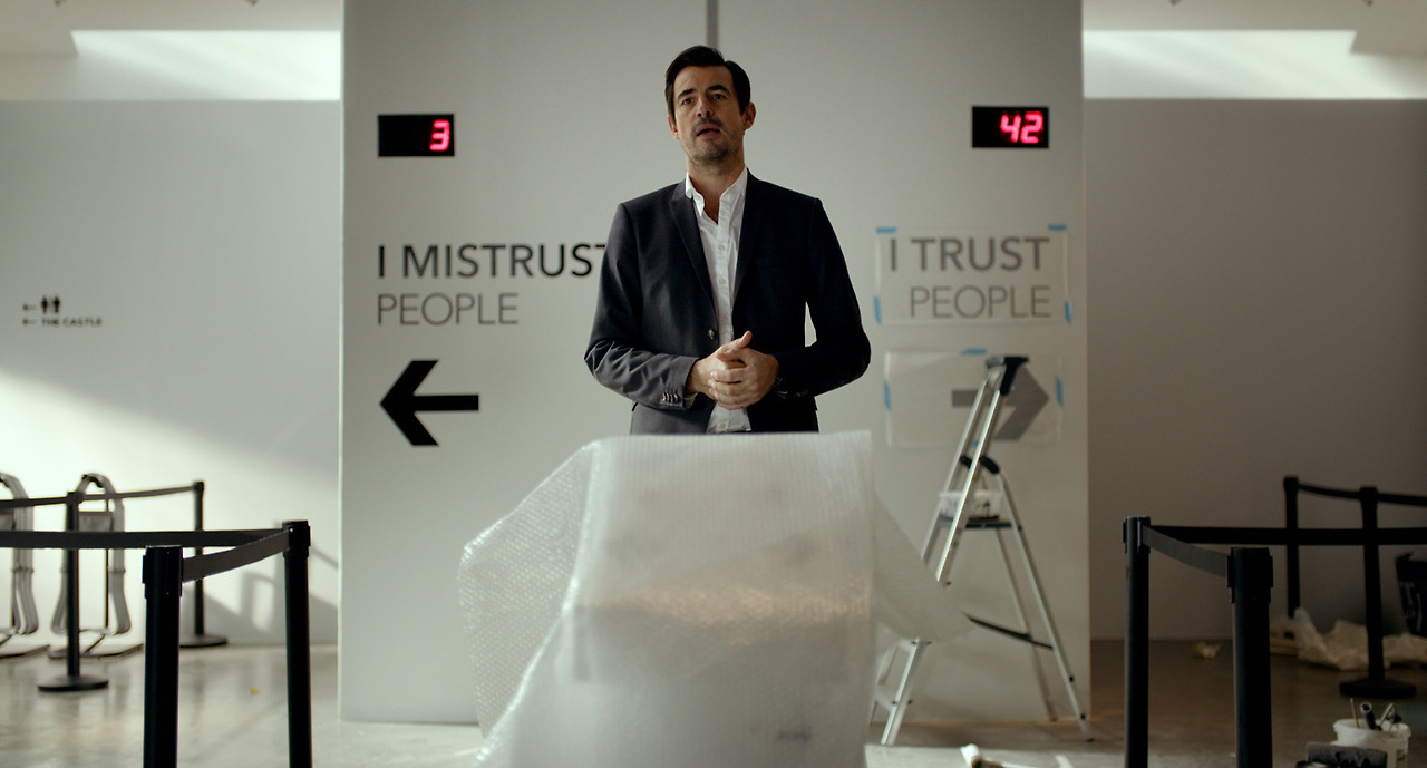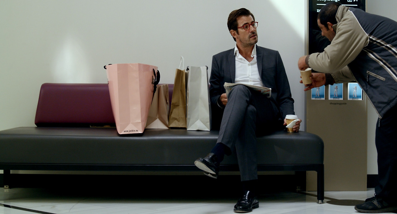 크리스티앙은 길에서 구걸하는 이들을 지나치지 못하고 그들의 요구사항을 조건 없이 들어주는 인물입니다. 미술관 큐레이터인 그는 직원들과 함께 파티에서 어울리기도 하며 수평적인 관계를 유지하고, 직원들이 그를 대하는 모습에서도 알 수 있듯 사려 깊고 세심한 인물입니다. 다른 한편으로는 쇼맨십이 있는 인물이기도 합니다. 미술관의 새 작품을 소개하기 전 홀로 거울 앞에 선 그가 긴장한 듯한 제스처까지도 연습하는 모습은 능청스러워 보이면서도 프로의 면모를 드러내 주기도 합니다. 이처럼 직업적으로나 도덕적으로 완벽해 보이는 그는 특정 사건을 전후로 인물의 특성이 반전되는데, 그를 둘러싼 세계도 함께 전환됩니다. 극 초반의 크리스티앙에게 구걸하는 이들은 무례하게 비치지만, 중후반부 쇼핑몰 장면에서 구걸하는 이들은 그에게 외면받기도 하고 짐을 지키도록 이용당하기도 합니다. 그는 공손한 어조와 매너를 유지하면서도 결국에는 자신의 이익에 따라 행동하는 기득권의 전형을 보여줍니다. 자신의 실수로 도둑 누명을 입은 이에게 발송할 동영상을 촬영하며 사과하다가도 “부의 재분배가 필요하다” 등의 이유를 들며 경제적 배경이 다른 이들에게 공감하지 못하는 변명을 늘어놓기도 합니다. 누명을 입은 또 다른 소년에게는 악의가 없었다며 억울함을 토로하기도 하지만 사과를 받아내려는 소년을 계단에서 밀치기도 하는 등 다른 계층을 향한 편견과 함께 마음속 깊은 적의를 드러냅니다. 그러나 크리스티앙은 소년을 돌려보낸 후 도움을 요청하는 목소리를 계속해서 듣게 되고, 점차 동요하기 시작하며 소년을 찾아 나섭니다.