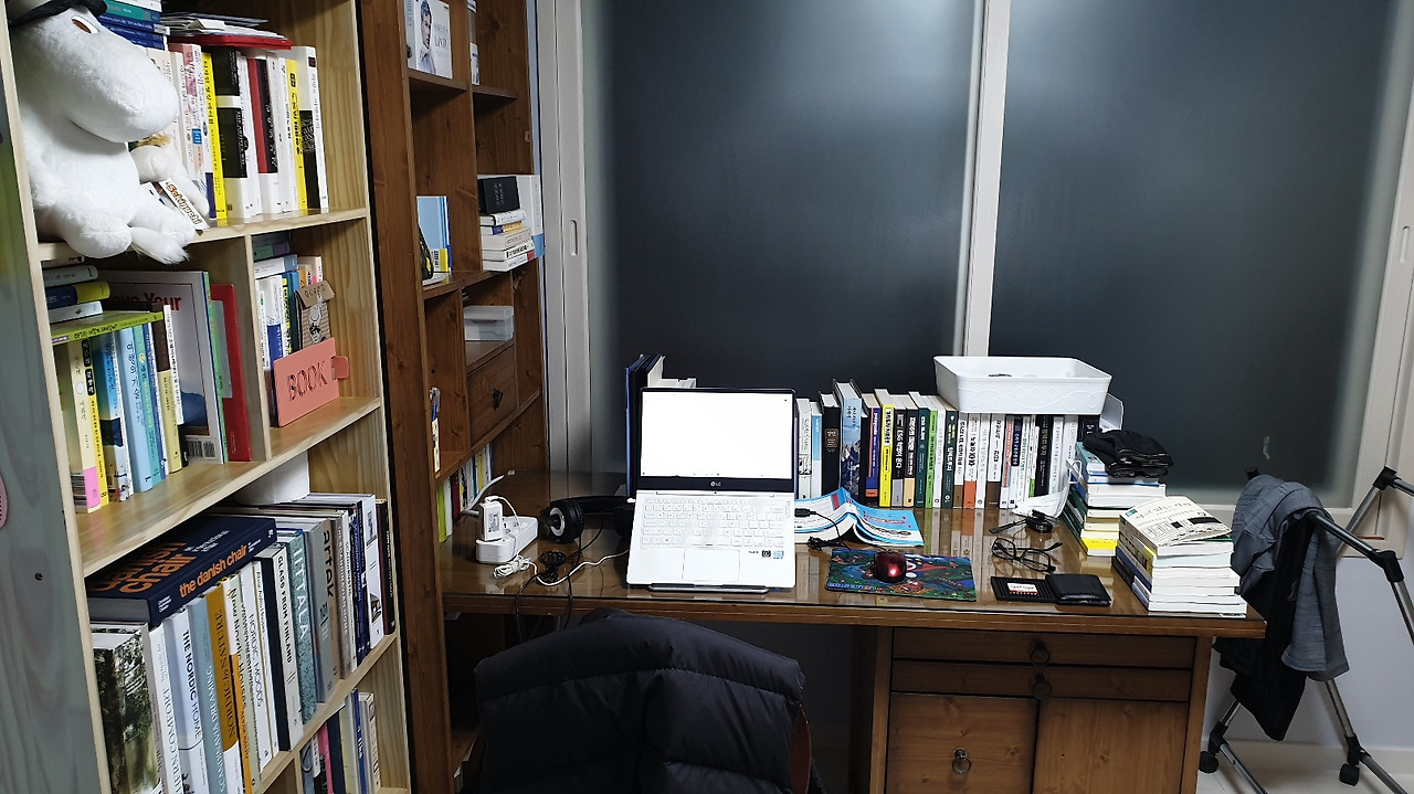 <지금 브런치에 글을 올리는 중의 본인 책상서재의 모습>
