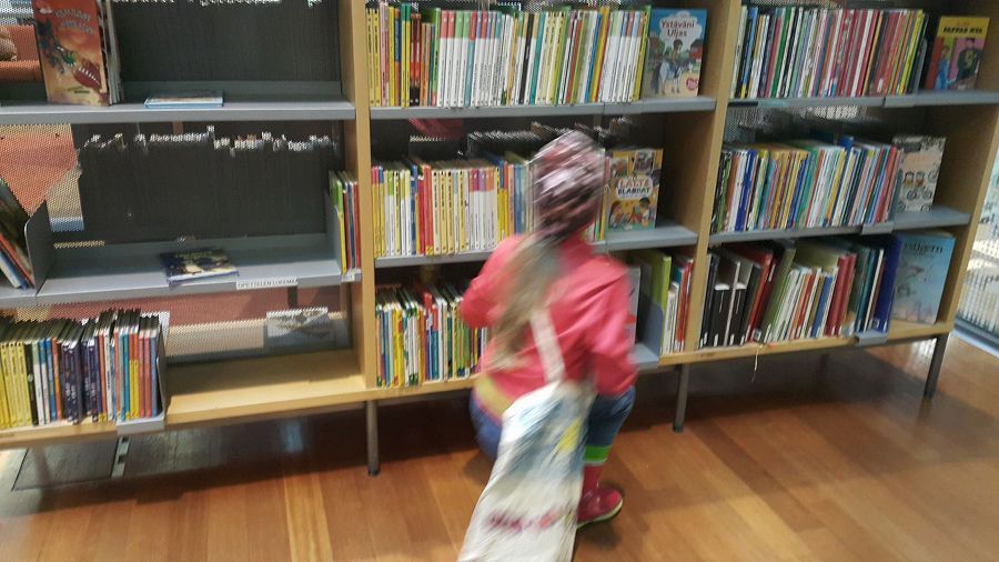 핀란드의 초등학생 아이가 바쁘게 움직이면서 책을 고르고 있다.